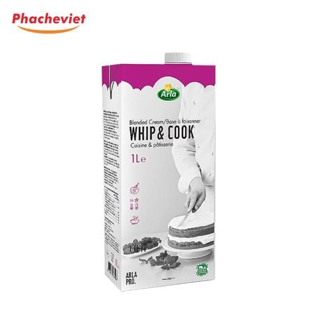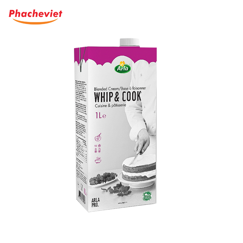 Đặc tính: Thành phần từ sữa tách béo và chất béo thực vật, Whip & Cook Arla Pro có khả năng đánh bông kem cao, tăng gấp 3 lần và độ ổn định kem tốt lên đến 48h. Đặc biệt, Whip & Cook tạo nét rõ khi bắt bông kem và được chịu nhiệt, acid tốt.
