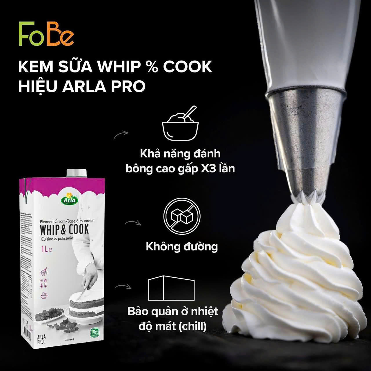 -Thành phần đặc biệt: Được làm từ sữa tách béo và chất béo thực vật, kem Whip & Cook Arla Pro có khả năng đánh bông gấp 3 lần so với thể tích ban đầu, đồng thời giữ độ ổn định lên đến 48 giờ.