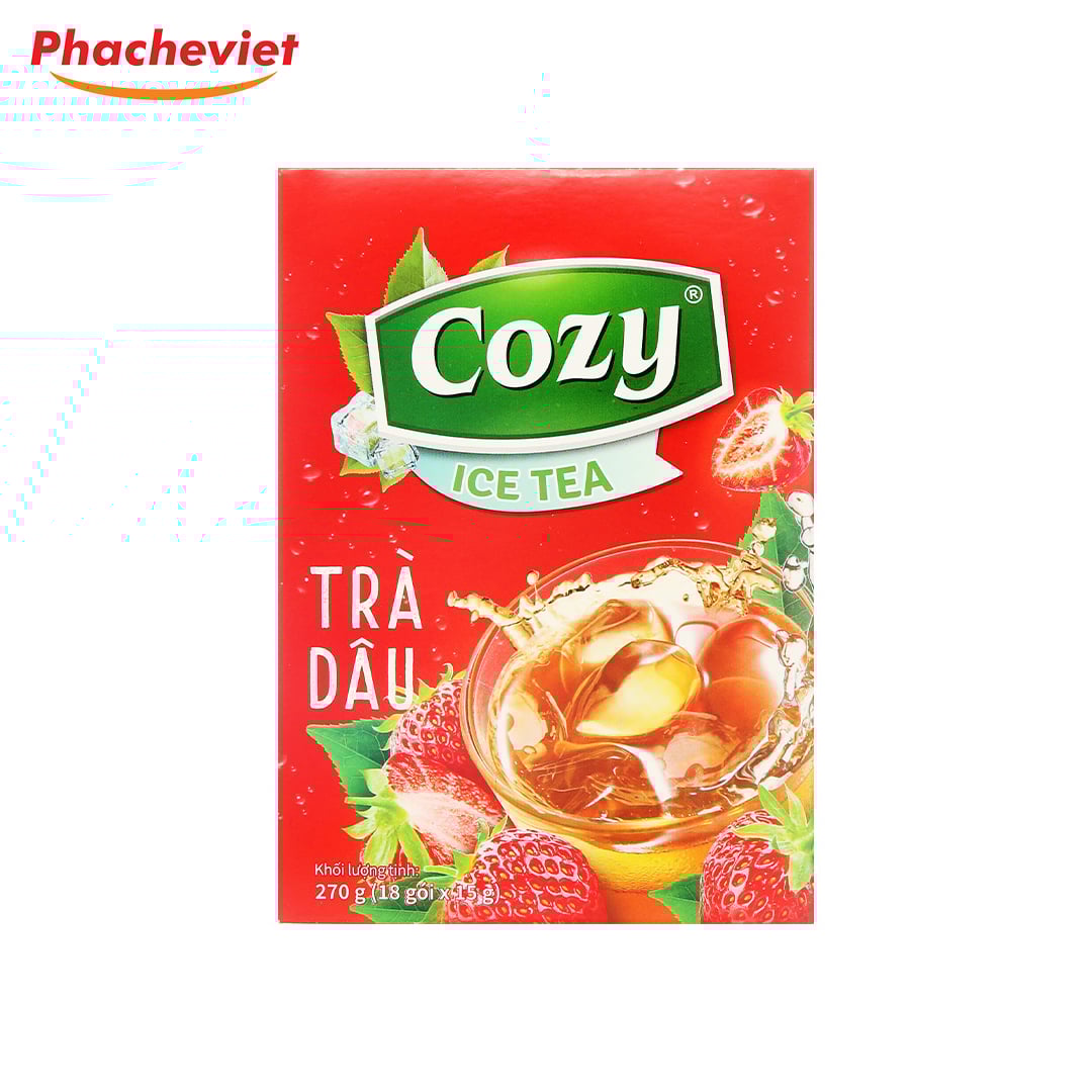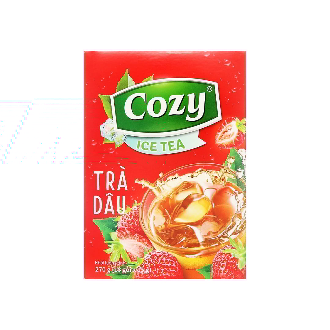 Là loại trà hòa tan tiện lợi thơm ngon, hương vị trà dâu cực hấp dẫn, được nhiều người yêu thích nhờ vị ngọt ngon tươi mát hòa chút vị chua chua tự nhiên, hài hòa. Trà dâu Cozy Ice Tea hộp 270g (18 gói x 15g) chính hãng trà Cozy thơm đậm đà hòi hài hòa vị nhịp sống